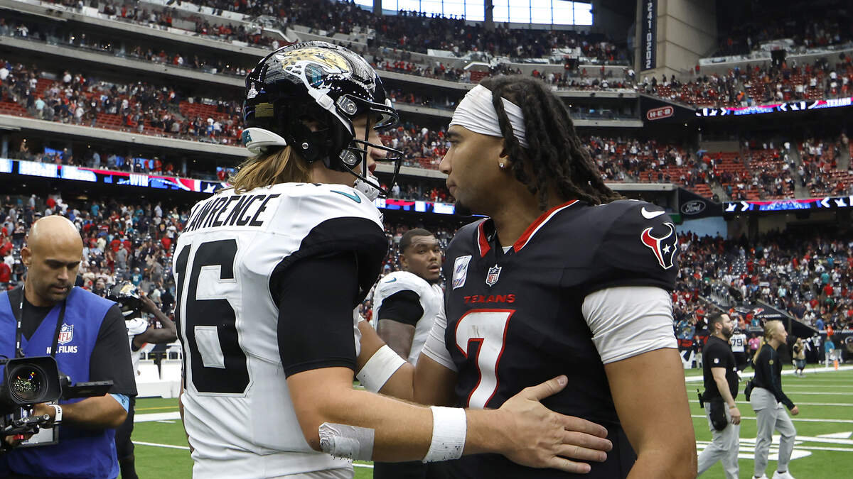 QB Trevor Lawrence finished the day 18/33 completions to attempts and 2 touchdowns. While his counterpart CJ Stroud finished with 27/40 and 2 touchdowns himself. Now while the stats tell you that they were pretty even, the tape shows and tells a different story line. Lawrence at times missing what seem as layups and overthrowing or plainly missing open receivers. Christian Kirk leading the pack with 7 receptions for 61 yards, and 1 touchdown. While Brian Thomas Jr. was right behind him with 6 receptions for 86 yards and 1 touchdown himself. On the ground, Tank Bigsby led he way with the first half push, but it was Travis Etienne Jr. who finished the game with 11 carries and 50 yards.