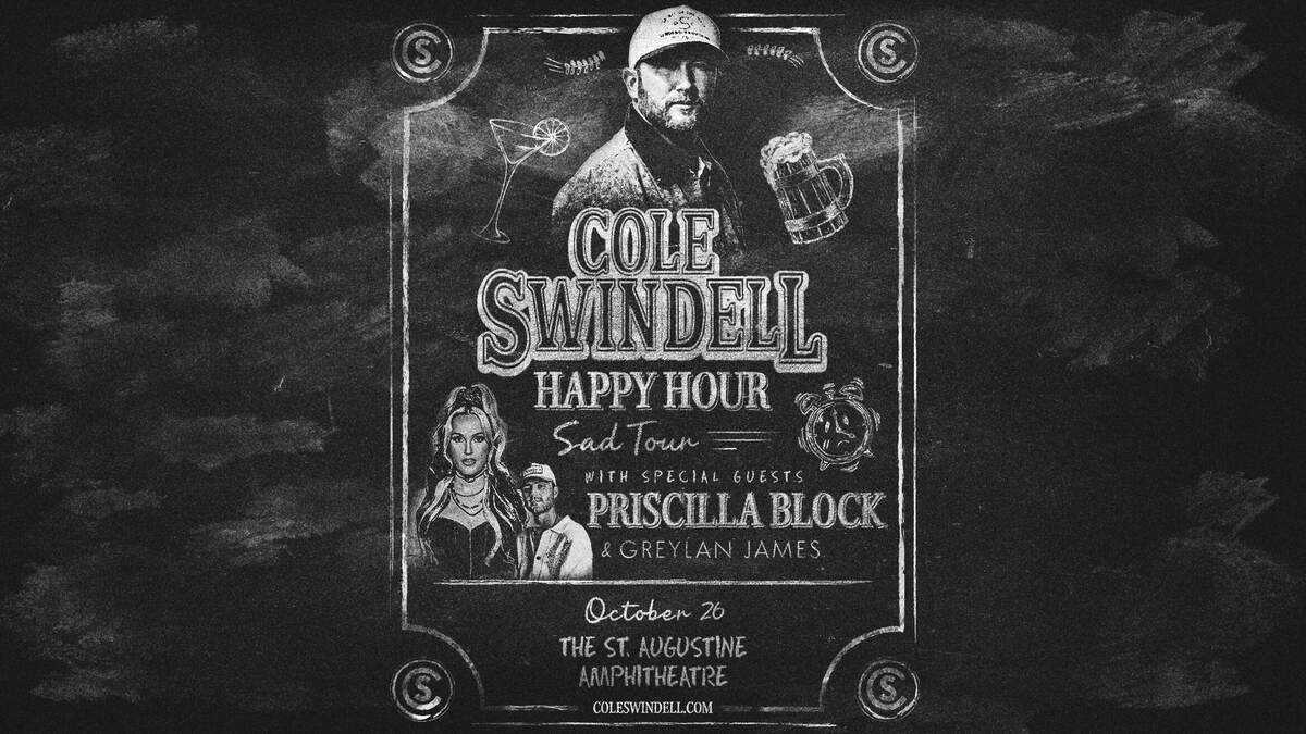 Cole Swindell is bringing the Happy Hour Sad Tour with special guests Priscilla Block & Greylan James to the St. Augustine Amphitheatre on October 26th! Get your tickets HERE